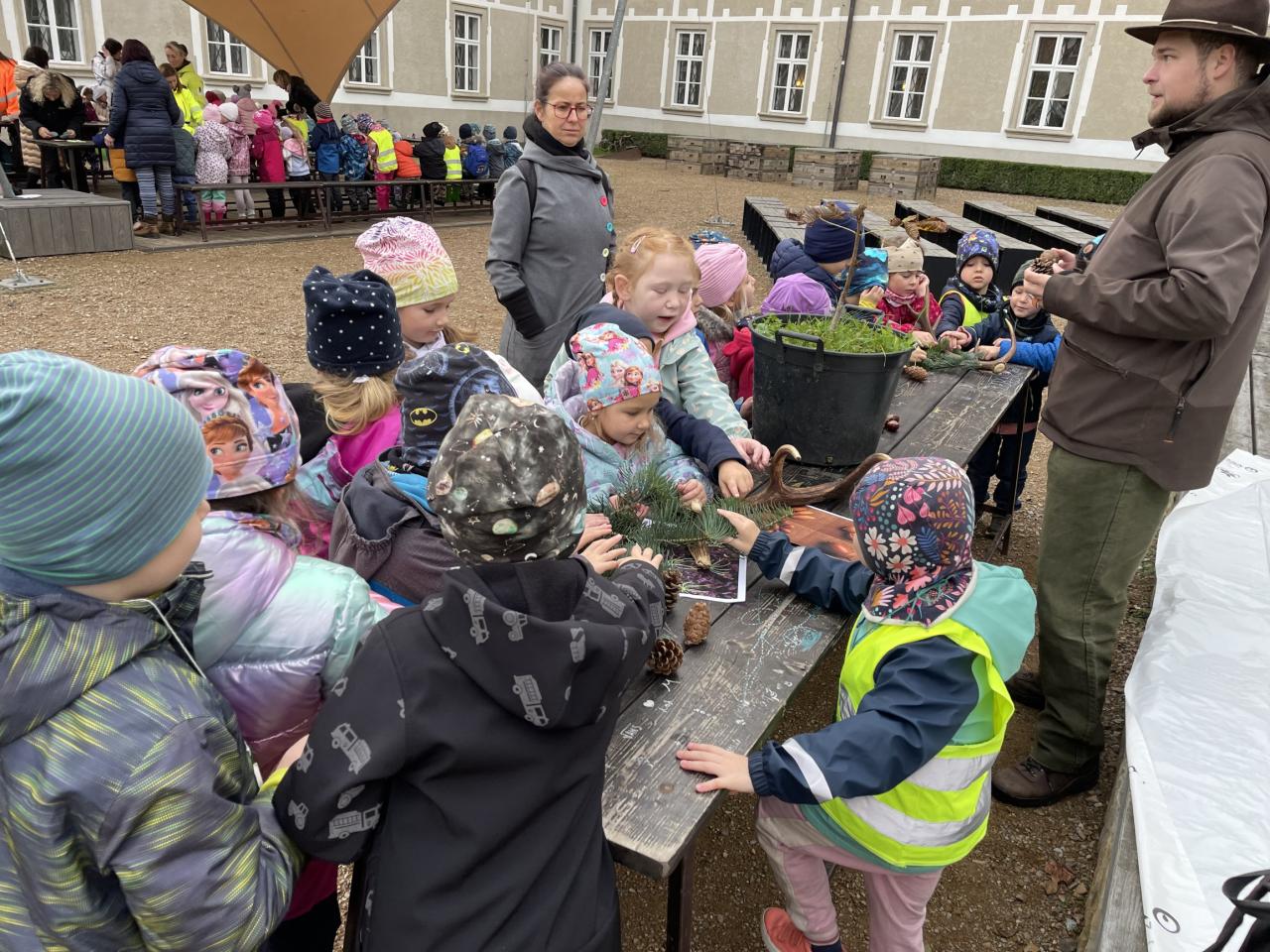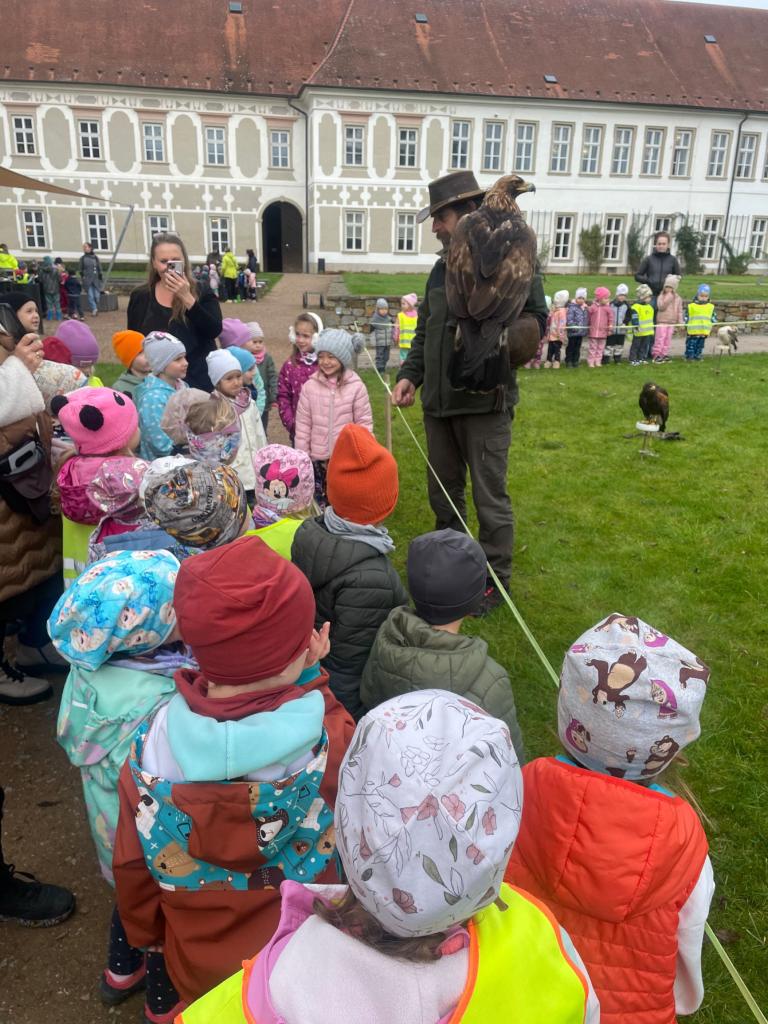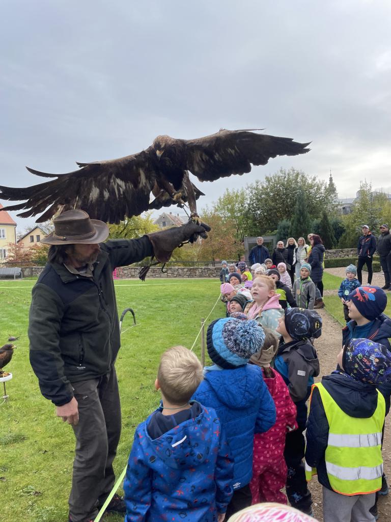 V Piaristických zahradách na nás čekala spousta zajímavých aktivit. Děti si mohly vyzkoušet poznávání listů a plodů různých dřevin, dozvědět se zajímavosti o lesních zvířatech a vytvořit si vlastní medajli. Nechyběla ani poutavá ukázka dravých ptáků, která všechny velmi zaujala.
