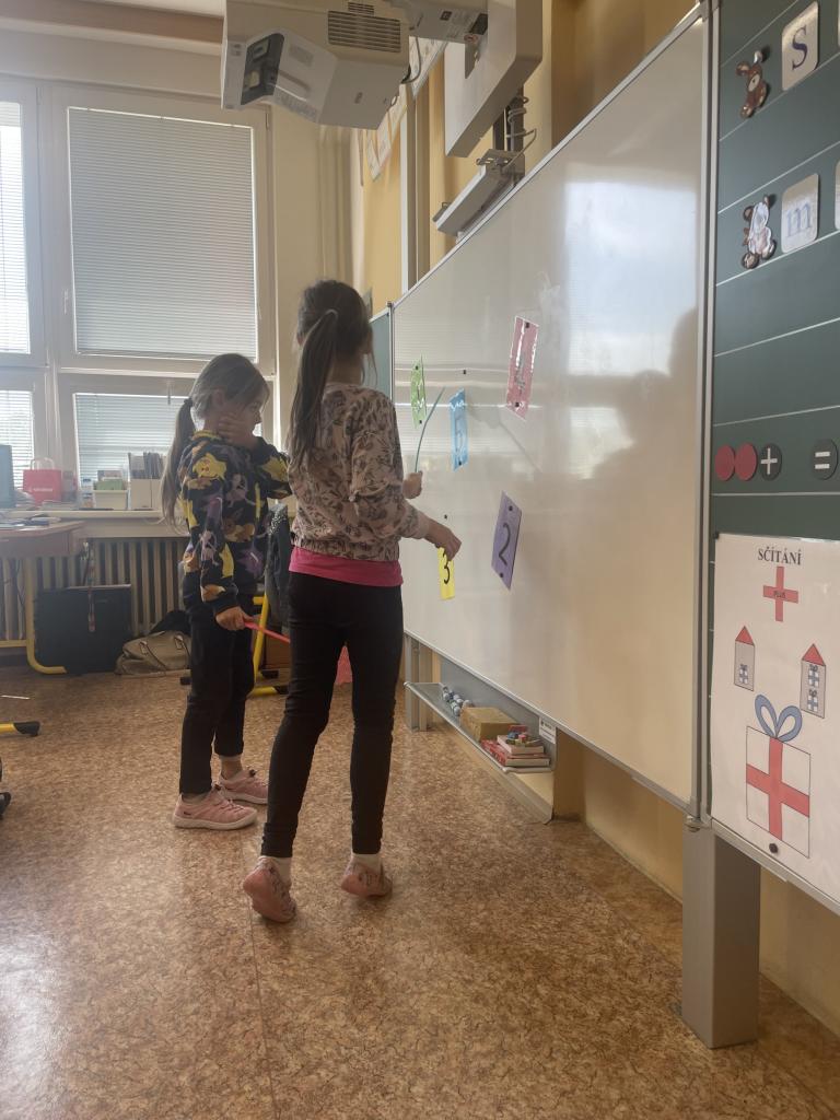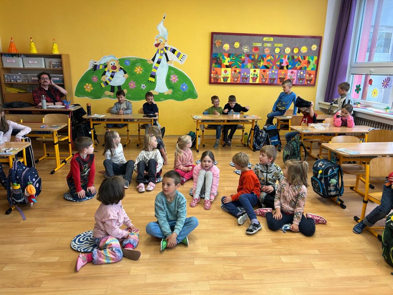 Děti měly možnost navštívit první třídy, posadit se do školních lavic a strávit příjemnou vyučovací hodinu společně se školáky. S velkým zájmem sledovaly, co se v první třídě učí a aktivně se zapojily do připravených činností. Některé si zkusily číst, jiné počítat nebo psát na tabuli.