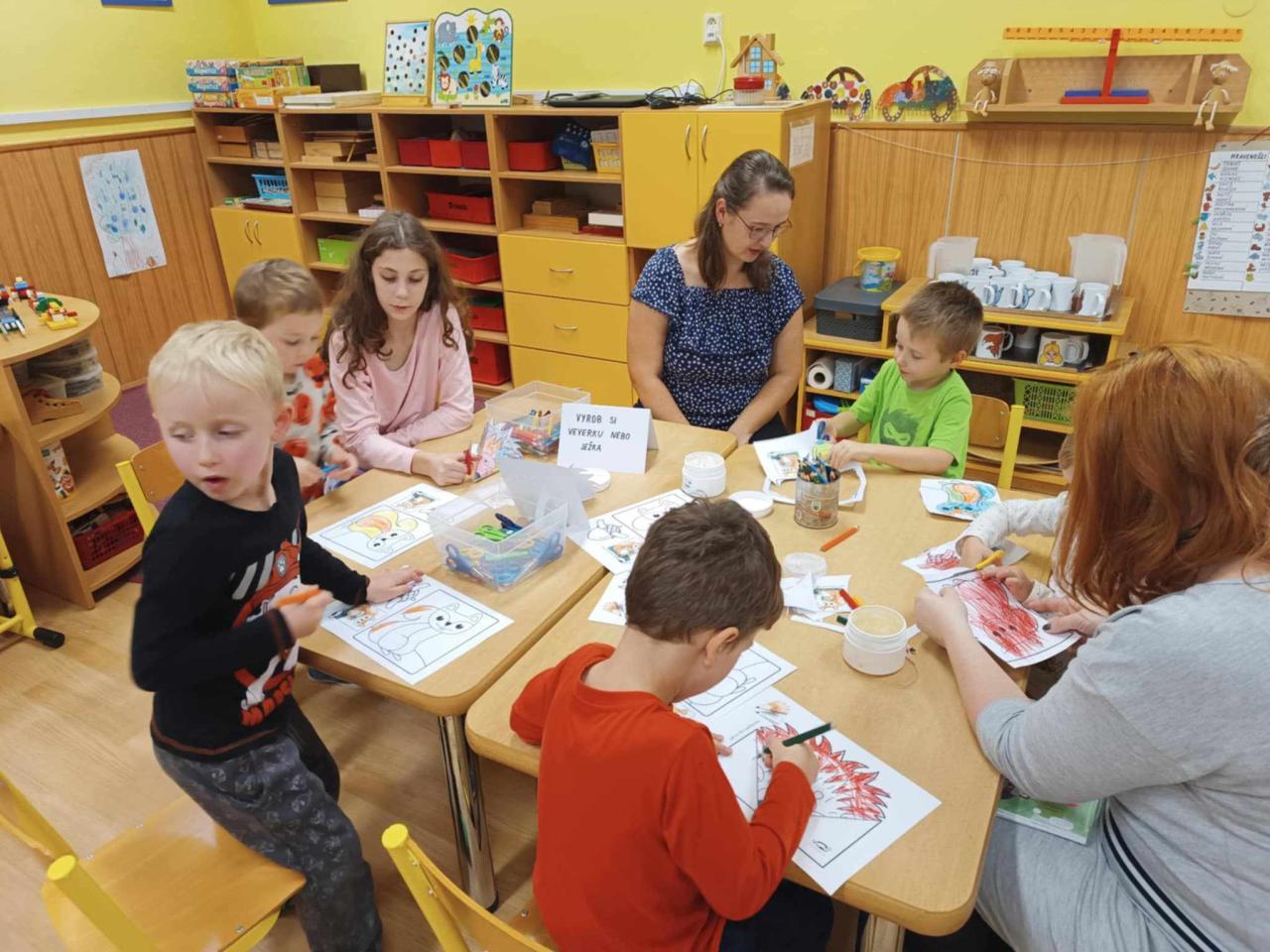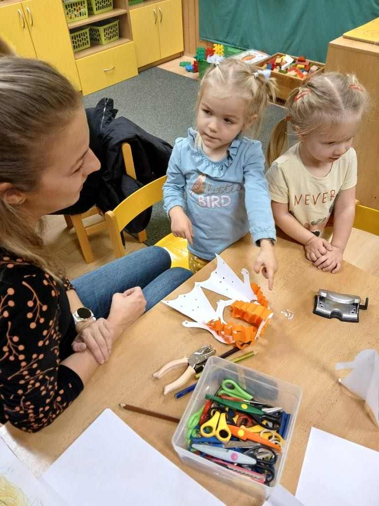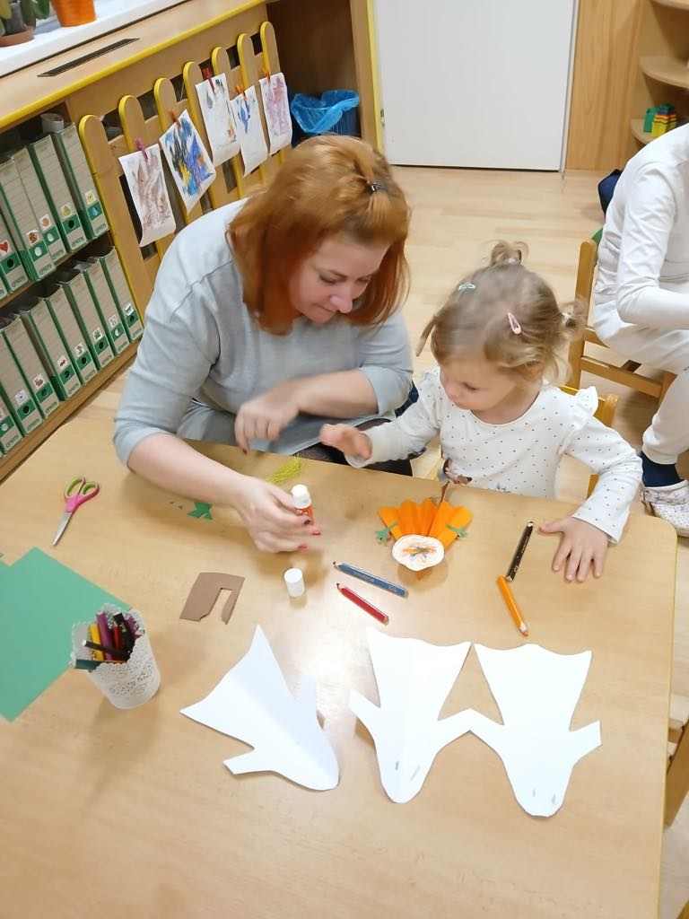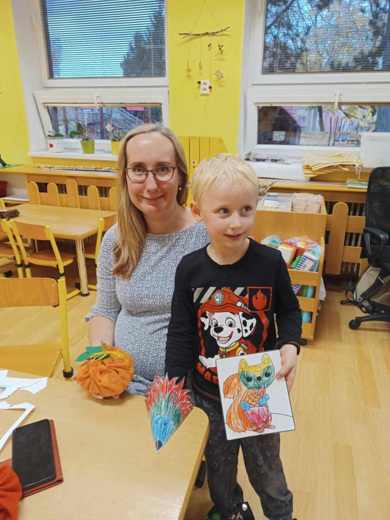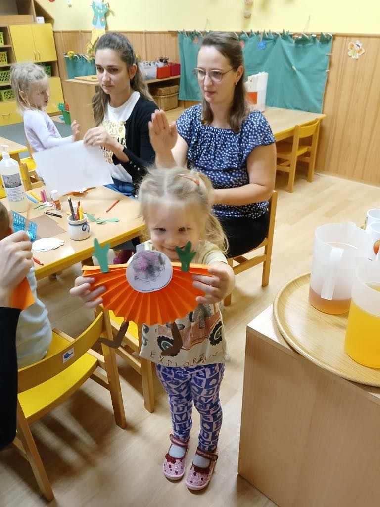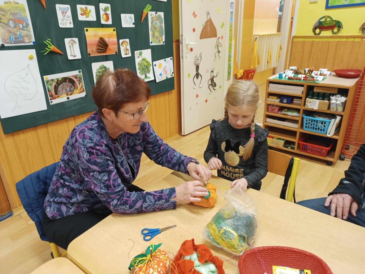 Děti a rodiče společně ušily dýni z látky a z papíru vyrobily dýňovou babičku, veverku a ježka.